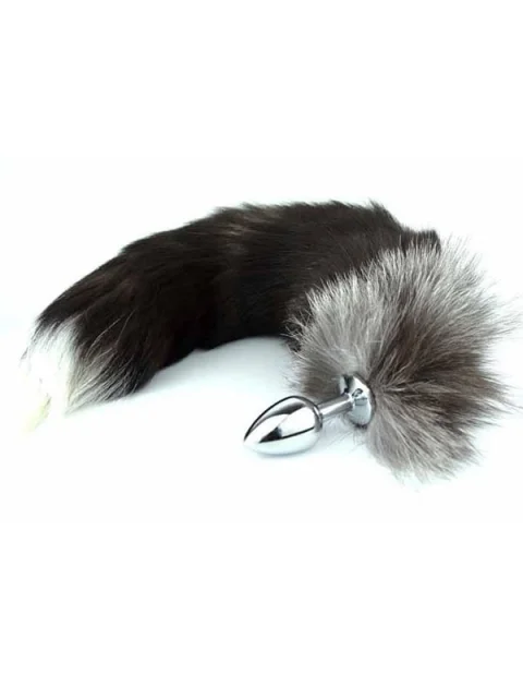 42 cm uzunluğunda gri ve beyaz renk tonlarında tüylere sahip çelik anal plug. Çelik plug 8 cm uzunluğunda ve 3,2 cm çapındadır.